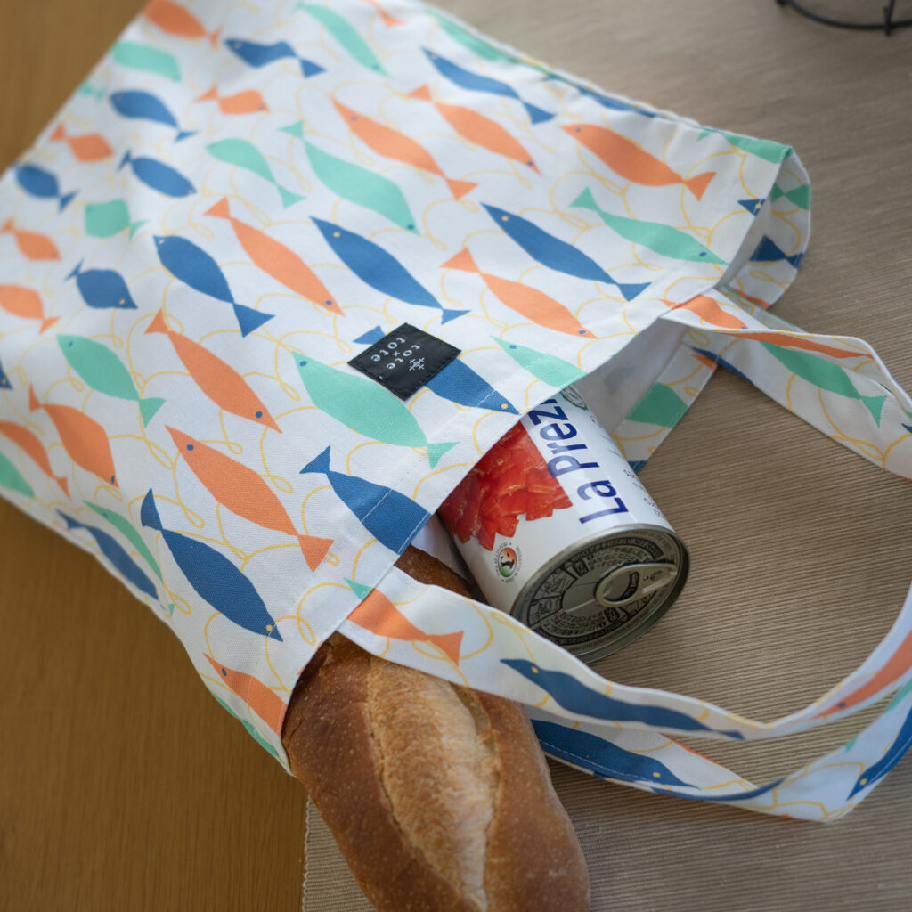 2024年4月20日 図案図鑑本日大漁 細長いフォルムは、海の中をいっそう早く泳ぐため。カラフルなとんがりさかなが、今日は大漁です。くるくる網目模様に、爽やかなカラーでレイアウト。今日のご飯はオイルサーディンのパスタ?夏の日差しに映えそうな涼やかなデザインです。 tote×totetotetoteトート・トートトートバッグ